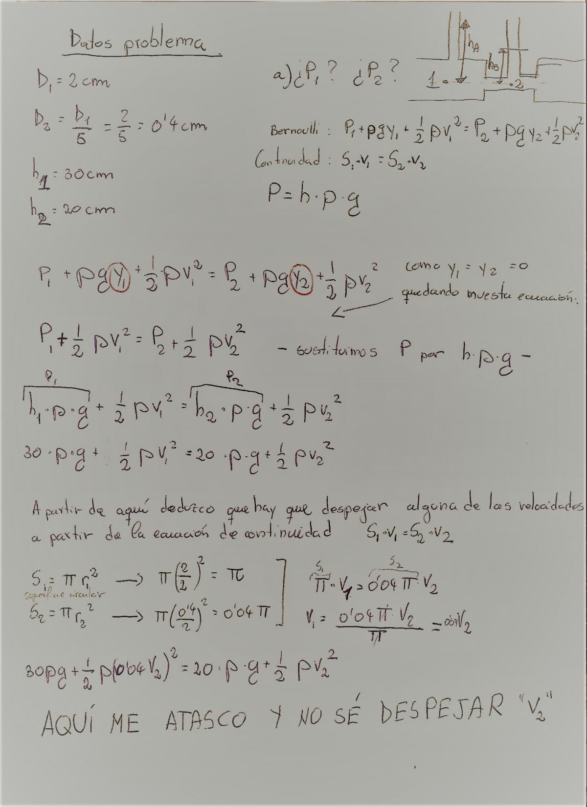 Muy buenas. Necesitaría ayuda con un problema de fluidos, exactamente con el apartado a), donde me pide averiguar la Presión en los dos puntos. Yo encuentro especialmente problematico el tener que despejar tanto "ro" (p) de la ecuación de Bernouiili. Os adjunto tanto el problema como hasta donde llego yo con la resolución. Alguna pista de como seguir o con que me digais que voy bien encaminado, me bastaría. Un saludo.![]()