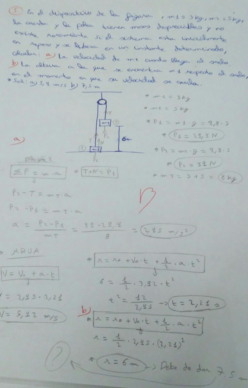 Hola muy buenas a todos unicoos!! Ésta vez tengo una duda concreta con el apartado b) de un problema de poleas de dinámica. El apartado a) me ha salido con la solución correcta que indica el problema, pero en el apartado b) me sale que el bloque 1 queda a una altura de 6 metros cuando en la solución del problema me indica que debería de quedar a 7,5 metros. La verdad es que no entiendo porque me debería de quedar a 7,5 metros ya que la longitud de la cuerda no cambia y es la misma que en la del apartado a). Aquí os dejo lo que he conseguido sacar. Me sería de gran ayuda que me pudierais decir donde me he equivocado o que estoy razonando mal y porque me sale 6 metros en lugar de 7,5 metros. Muchas gracias, Saludos!!