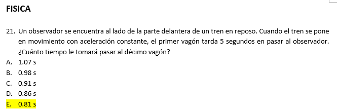 15,8114 s ≅ t10, que es el tiempo que transcurrió hasta que el décimo vagón pasó por la posición del observador.