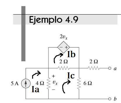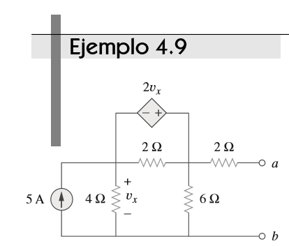 Para fuente dependiente de voltaje: Pasa una corriente de Ib = 10 A. Y tendrá un voltaje de 2 vx = 2 [ 4 (Ia - Ic) ] = 2{ 4 [5 - (10/3)] } = 40/3 V (aproximadamente 13.33 V).