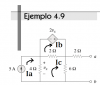 Para resistencia de 4 Ω: Pasa una corriente de Ia - Ic = 5 - (10/3) = 5/3 A (aproximadamente 1.67 A). Y tendrá un voltaje de 4 (Ia - Ic) = 4 (5/3) = 20/3 V (aproximadamente 6.67 V).
