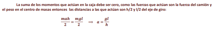 Un camión transporta una caja uniforme de masa m, altura h y una sección cuadrada de lado L. ¿Cual es la máxima aceleración que el camión puede tomar sin que vuelque la caja?suponer que la caja vuelca antes de resbalar.