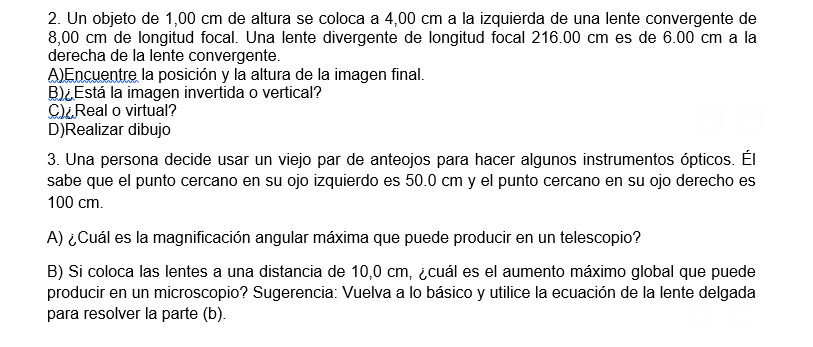 Hola Unicoos. Me podéis ayudar con estos dos ejercicios sobre óptica geométrica que me están causando muchos problemas. ya mire algunos de sus vídeos acerca de estos temas pero no logro comprender con exactitud estos problemas.. Gracias de antemano. Espero me podáis ayudar.![]()