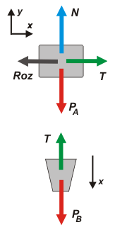 Espero que estemos de acuerdo. Sobre el bloque A operan cuatro fuerzas: su peso, PA, el apoyo sobre la mesa, N, la fuerza de rozamiento que impide que deslice, Roz, y la fuerza con la que tira la soga, T. Sobre el balde operan apenas dos fuerzas: su propio peso, PB, y la fuerza que le hace la soga, T.