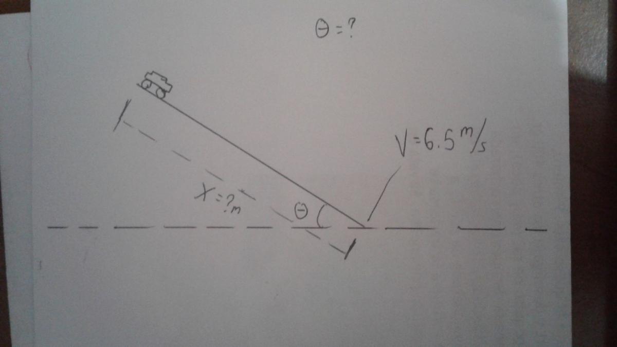 "Un carro a control remoto de 0.2kg de masa puede llegar a una velocidad máxima de 6.5m/s pero por falta de carga de batería solo puede llegar a 3m/s (con una aceleración de 2.25m/s^2) por sí solo en posición horizontal. Se quiere usar un plano inclinado para ayudar al carro a llegar a su velocidad máxima. Determine la distancia del plano inclinado, si se propone un ángulo de inclinación de 45°, que se necesita para llegar a la velocidad máxima si el carro empieza desde el principio del plano en reposo. El coeficiente de fricción del carro y la superficie es de 0.7(estático) y 0.6 (dinámico)."
