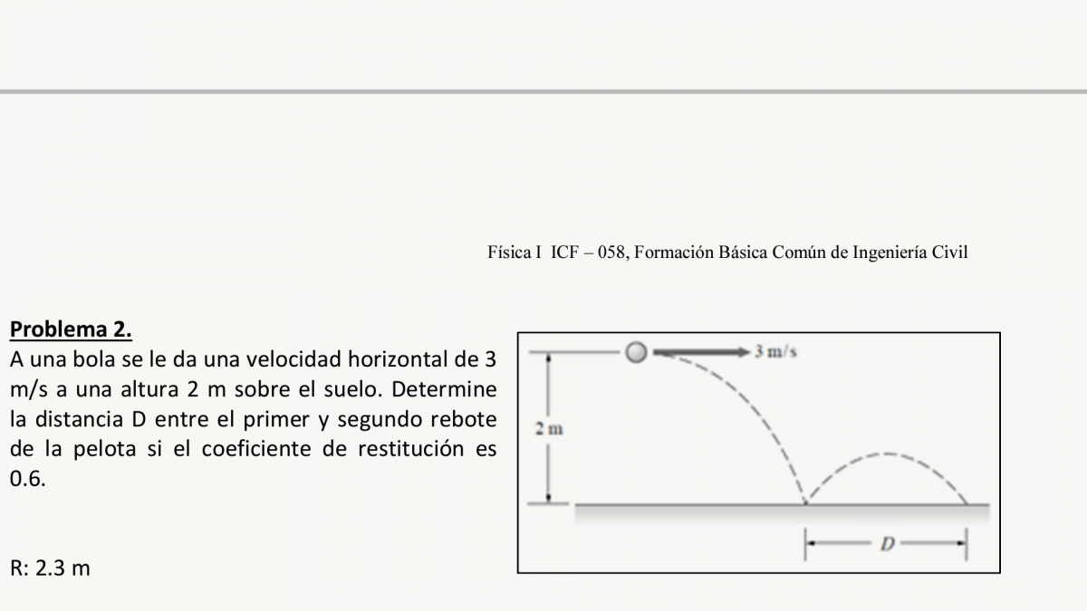 Tendras que plantear que se produce un tiro horizontal, con lo cual podrás hallar la distancia respecto al suelo, es decir, el alcance, despues debereas utilizar el coeficiente de restitución para saber la velocidad final que será la inicial en el 2º rebote.