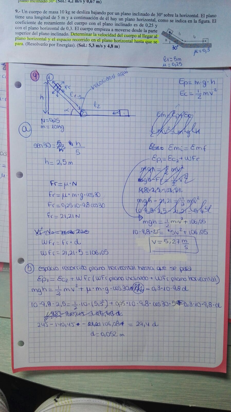 Fíjate que la velocidad final es cero ya que se detiene , 5.3 es su velocidad cuando llega al pie del plano pero ... pero tú necesitas la velocidad en el punto final (para obtener la cinética) que indican se detiene .