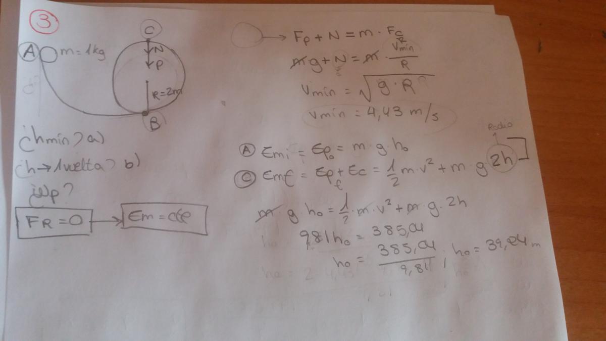 No sé como hacer este ejercicio,no me salen iguales los resultados. ¿Desde qué altura minila tiene que soltarse un cuerpo de 1kg en el rizo para que pueda alcanzar el punto más alto?¿Y para que pueda dar uma vuelta sin caerse? Calcular el trabajo que realiza el peso del cuerpo desde la posición B hasta la C. Se desprecia el rozamiento. ![]()