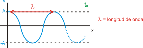 La distancia entre dos puntos consecutivos con el mismo desplazamiento vertical se denomina longitud de onda (λ) y en el S.I. se mide en metros. Se define también otra variable relacionada llamada número de ondas (k):![]()