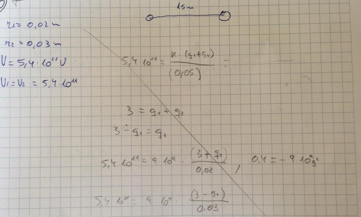 Esf1: k*Q1/r1 = Vf, y de aquí tienes: Q1 = Vf*r1/k = 5,4*1011*6*10-2/9*109 = 3,6 c;
