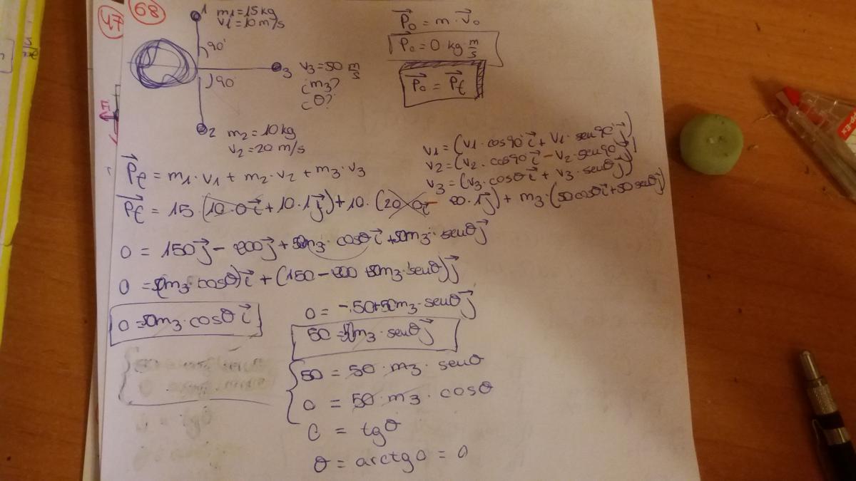 En una explosión una roca sale despedida en tres feagmentos distintos, dos de los cuales, de masas m1=15kg y m2=10kg, salen en angulo recto con velocidades de v1=10 m/s y v2=20 m/s, respectivamente. El resto sale despedido con una velocidad v3=50m/s. Calcula la dirección y la masa del tercer frgamento.