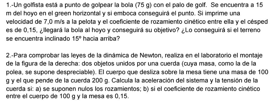 Para el primero: Ya que no nos dan el radio, imagino que despreciamos la rotación de la pelota. En este caso, la única fuerza que actúa es la de rozamiento: Froz=μmg. Tenemos por lo tanto un movimiento rectilíneo con aceleración constante a=μg=1.5 (por simplificar los números, he tomado g=10m/s2). La posición y velocidad como función del tiempo están dadas por lo tanto por:
