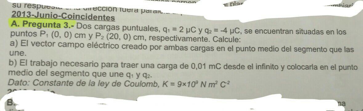 Ayuda porfavor con el apartado b) el W=q(AV) el problema es que no entiendo como puedo calcular el potencial para el infinito. Gracias de antemano