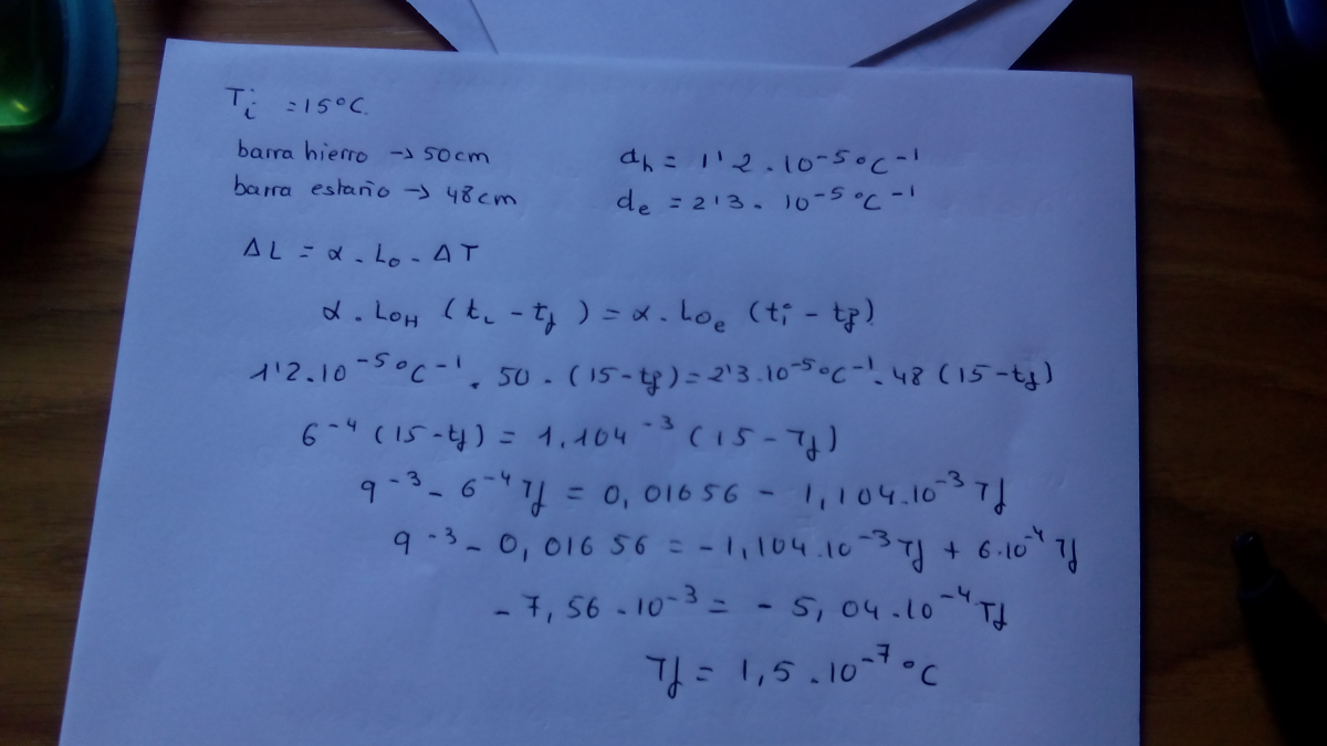 Para el hierro: ΔL = Lf - 50 = 12x10-6*50*(Tf - 15) → Lf = 50 + 12x10-6*50*(Tf - 15) (1)