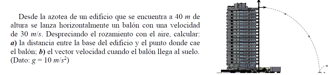 Consideramos un sistema de coordenadas OXY con origen en la base del edificio debajo del punto de partida, con y positivo hacia arriba y x positivo hacia la derecha, tomamos como instante inicial t = 0 y empleamos segundo como unidad de tiempo y metro como unidad de longitud..