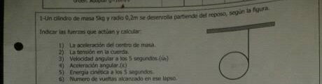 Por si no se llega a leer les comento que el enunciado dice: Un cilindro de masa 5kg y radio 0,2m se desenrrolla partiendo del reposo, segun la figura. Indicar las fuerzas que actuan y calcular: