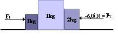 D1. La superficie, que aparece en la figura, es perfectamente lisa. Si la fuerza aplicada F1 es igual a 18iN, ¿cuál es la fuerza que el bloque de 2kg ejerce sobre el de 3kg?