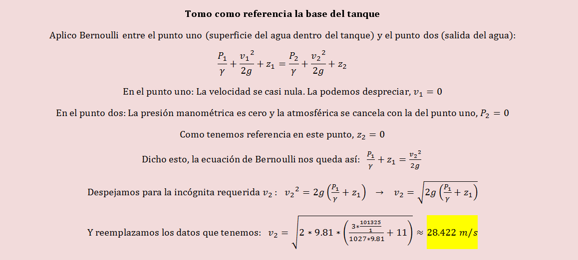 Un tanque sellado que contiene agua de mar hasta una altura de 11.0 m contiene también aire sobre el agua a una presión manométrica de 3.00 atm. Sale agua del tanque a través de un agujero pequeño en el fondo. Calcule la velocidad de salida del agua.