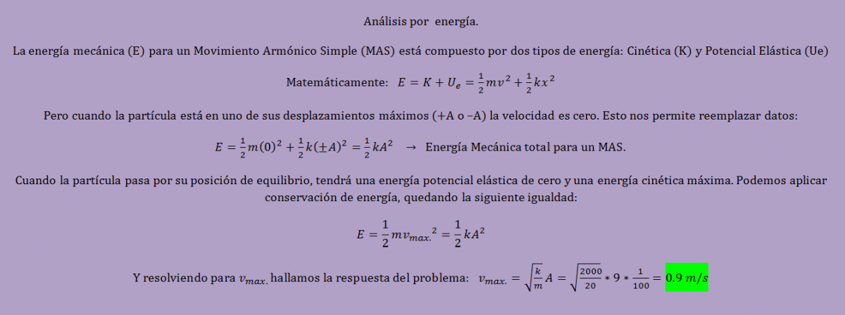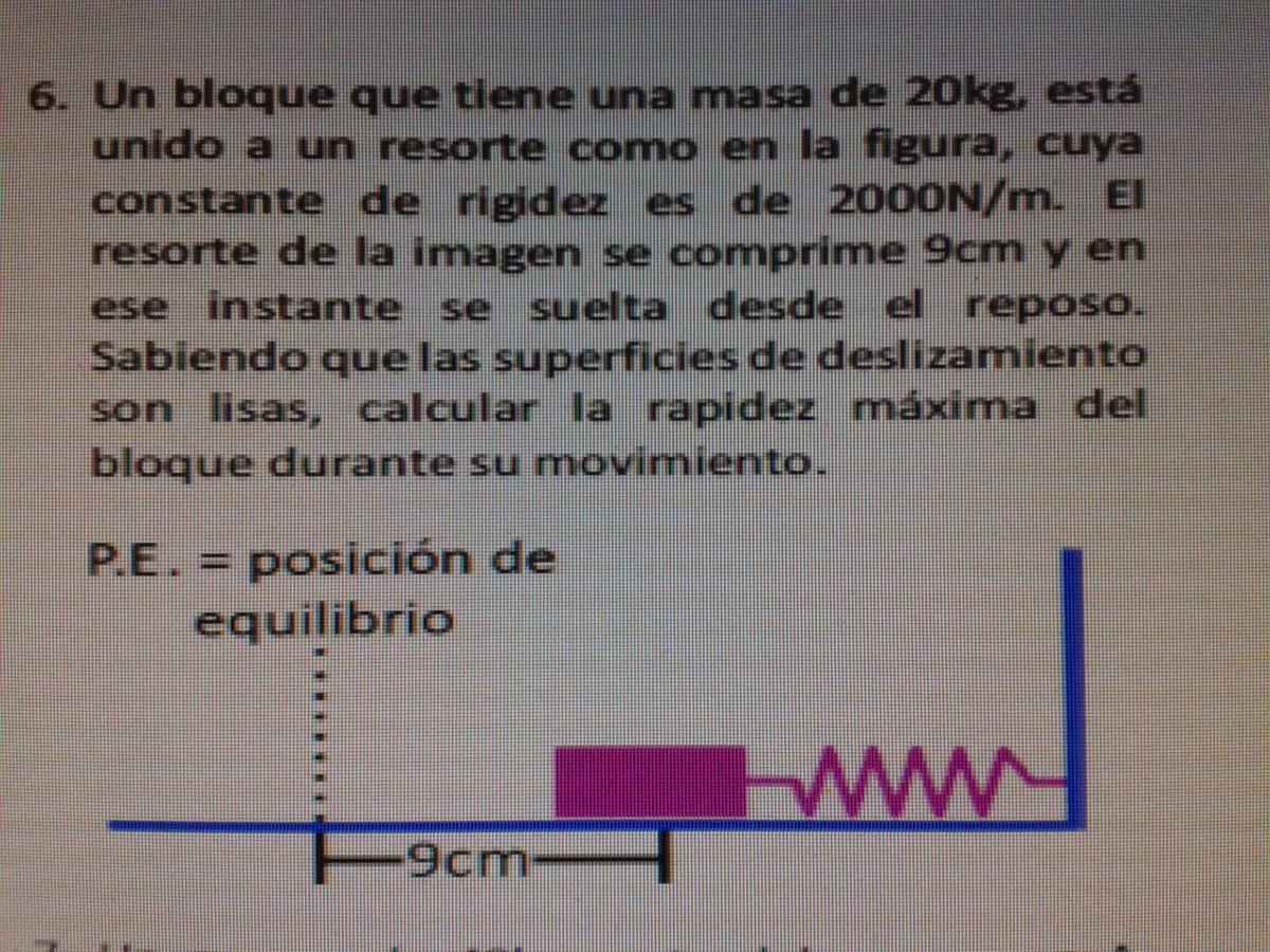 Disculpa por tardar en responder, lo que pasa es que he estado ocupado, bueno ahora si entiendo, la vmax se refiere cuando el objeto o particila a llegado a comprimir el resorte y sale impulsado por el mismo resorte, entonces tendremos que calcular la velocidad maxima... es asi Francisco? La explicacion de ejercicio o me equivoco?