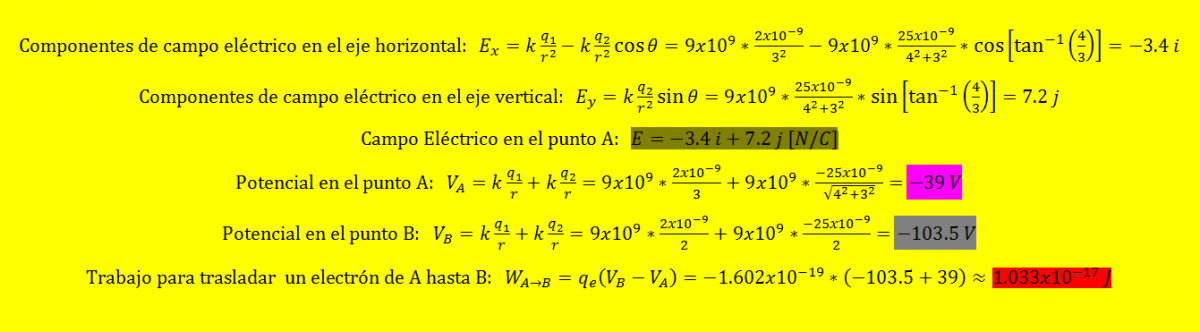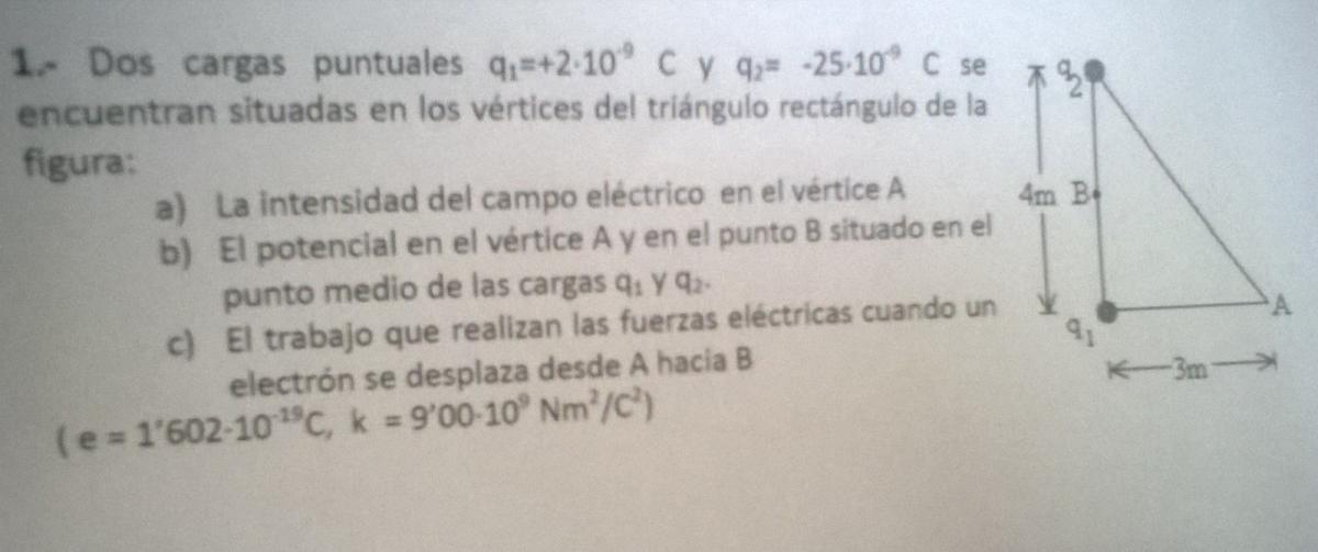 Así pues, el la intensidad del campo eléctrico en el punto A será igual a la suma del campo eléctrico producido por la carga q1 más el campo producido por la carga q2. En el apartado b) deberás hacer lo mismo con el potencial en los puntos que se indica.