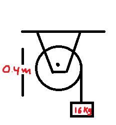 Un bloque de 16kg se pone en el extremo de una cuerda que pasa alrededor de un volante de 0.40m de diametro y cuelga verticalmente como se muestra. El momento de inercia del volante es 0.50kg*m². Cuando se libera el bloque y la cuerda se desenrolla, la aceleracion de l bloque es en m/s²: