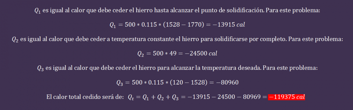 ¿ que cantidad de calor debe ceder 500 g de hierro que se encuentra fundido a 1770 °C para solidificar y llegar a 120 °C ?