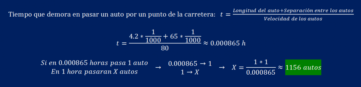 por una autopista de dos carriles circulan los automóviles en caravana a una velocidad de 80 km/h separados una distancia de 65m. ¿Cuántos automóviles circulan por hora un determinado punto de la autopista? Considerar la longitud media de los coches de 4,2m. La respuesta que me dan no me coincide y no sé qué más hacer. Gracias