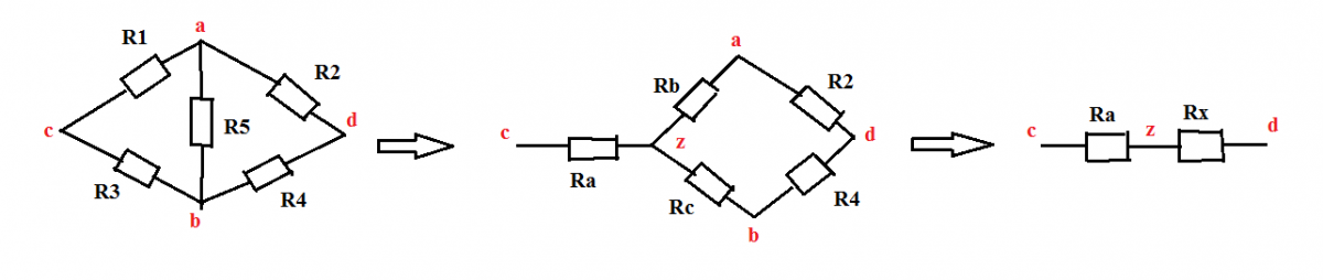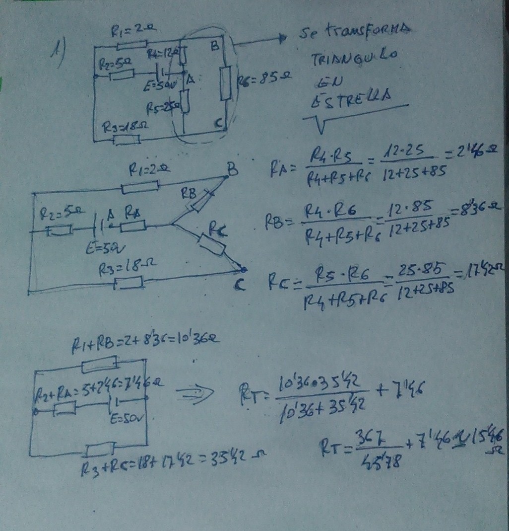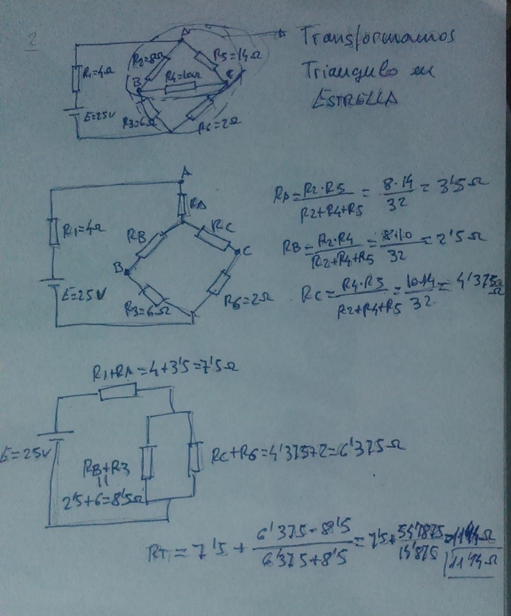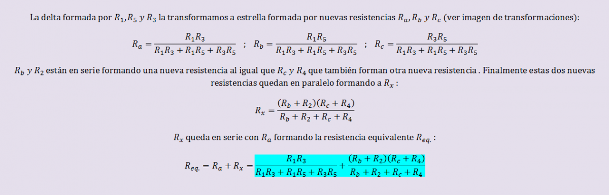 Hola Félix. Te dejo tres imágenes. La primera es donde hago las explicaciones y los cálculos. La segunda es un bosquejo del problema. Y la tercera son las transformaciones para pasar de delta a estrella y viceversa. Para tener la respuesta final en función de las resistencias iniciales, tan solo debes reemplazar los valores de Rb y Rc en la respuesta resaltada. Si existen dudas, házmelo saber.