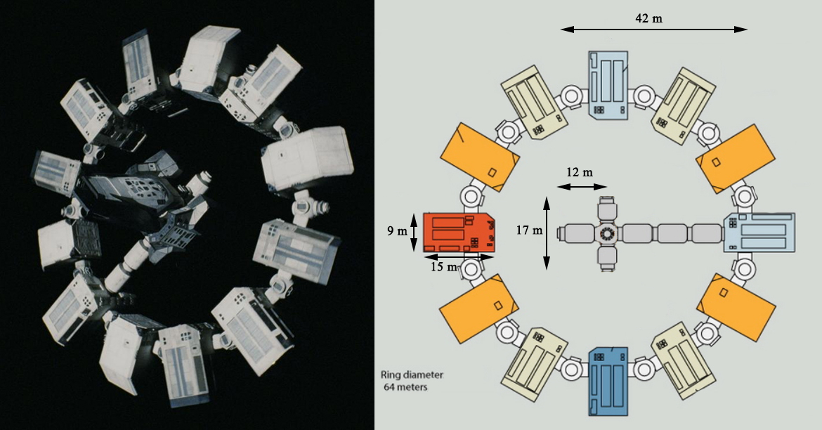 a) Cual es el momento de inercia de la nave respecto a el eje de rotación? La nave gira con un movimento de rotación de 5.6 rpm para conseguir en el interior de los mòdulos una gravedad ficticia similar a la de la Tierra.