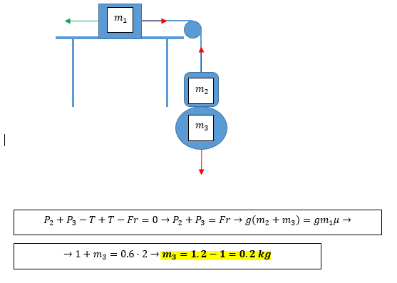 Tenemos dos cuerpos de masas m1 = 2 kg y m2 = 1kg colgados de los extremos de una cuerda que pasa por una polea. Las masas de la cuerda y de la polea se pueden considerar negligibles. El primer cuerpo está sobre una mesa horizontal y existe rozamiento con ella, el segundo cuerpo está colgando. ¿Qué masa adicional habrá que añadir al segundo cuerpo para que el conjunto no se mueva?