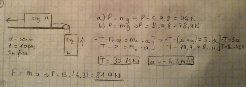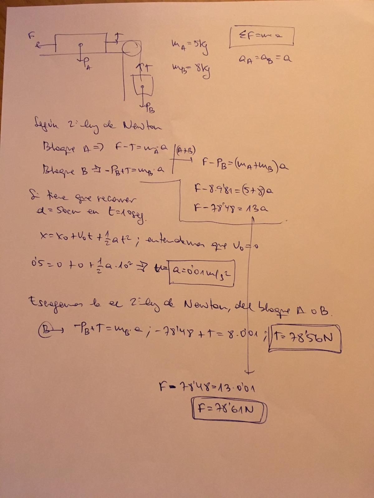 El enunciado es el siguiente: Un cuerpo de 5kg de masa descansa sobre una mesa sin rozamiento y está sujeto mediante una cuerda que pasa por la garganta de una polea a otro cuerpo de 8 kg. ¿Qué fuerza horizontal hay que aplicar al primer cuerpo para que avance 50cm sobre la mesa en 10segs? ¿Cuál es la tensión de la cuerda?