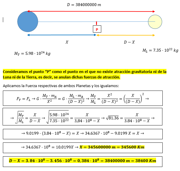 Determina el punto (distancia) entre la Tierra y la Luna donde las naves Apolo que viajaron a la Luna no estuvieron sometidas a fuerza de atracción gravitatoria, es decir, donde se anulan las fuerzas de atracción de la Tierra y de la Luna. Distancia entre centros Tierra-Luna 384000 km.