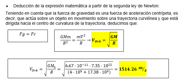 La nave espacial que esté en órbita circular en torno a la Luna a 400 km de altura sobre su superficie, ¿qué velocidad orbital tiene? ML: MT/81 RL: 1738 km. RT= 6370 km Solución: v = 1516,36 m/s (5458,9 km/h)