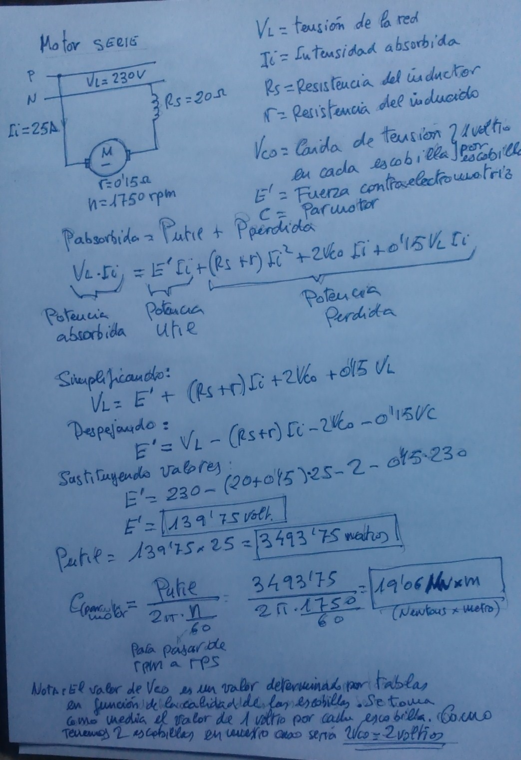 Tengo un problema: Un motor con excitación en serie trabaja en plena carga, absorbiendo 25 A de una red de 230 V y girando a una velocidad de 1750 rpm. La resistencia del inducido vale 0,15 ohmios y la del inductor , 2 ohms. Suponiendo que las pérdidas mecánicas y en el hierro ascienden a un 15 % de la potencai absorbida, calcula: A) La fuerza contraelectromotriz inducida. B)La potencia útil. C) El par motor interno.