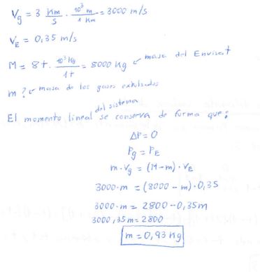 Envisat es uno de los satélites lanzados por la Agencia Espacial Europea para estudiar el medioambiente a escala global. Para cambiar o modificar su órbita utiliza como combustible hidracina (N2H4). El módulo de propulsión proporciona una velocidad de salida de gases de unos 3km/s. Si queremos incrementar la velocidad del Envisat (m=8T) en 0,35 m/s, ¿cuánta masa de hidracina se necesitará?