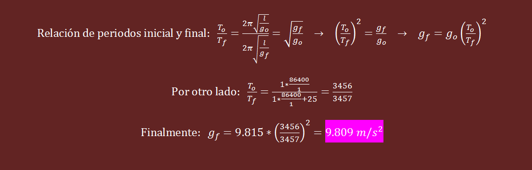 Un reloj  de  péndulo que  ha  sido cuidadosamente  calibrado para  marcar  el  tiempo correcto en un lugar  donde  g  vale  9,815  ms-2,  retrasa  25  s  por  día  cuando se  lleva  a  otro lugar  geográfico. ¿Cuánto vale  g  en  ese lugar?