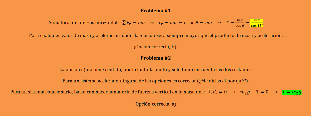 1) Una caja de masa "m" es empujada con aceleracion constante "a" en un piso horizontal sin friccion mediante un cable que forma un angulo de 15° con el piso. Si T es la tension que trabaja cobre el cable, entonces A) T = m.a; B)T > m.a; C) T < m.a