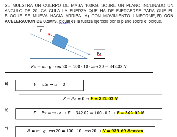 Este es el enunciado yo lo resolvi pero mi duda es con la b. SE MUESTRA UN CUERPO DE MASA 100KG. SOBRE UN PLANO INCLINADO UN ANGULO DE 20, CALCULA LA FUERZA QUE HA DE EJERCERSE PARA QUE EL BLOQUE SE MUEVA HACIA ARRIBA: A) CON MOVIMIENTO UNIFORME, B) CON ACELERACION DE 0,2M/S, c)cual es la fuerza ejercida por el plano sobre el bloque.