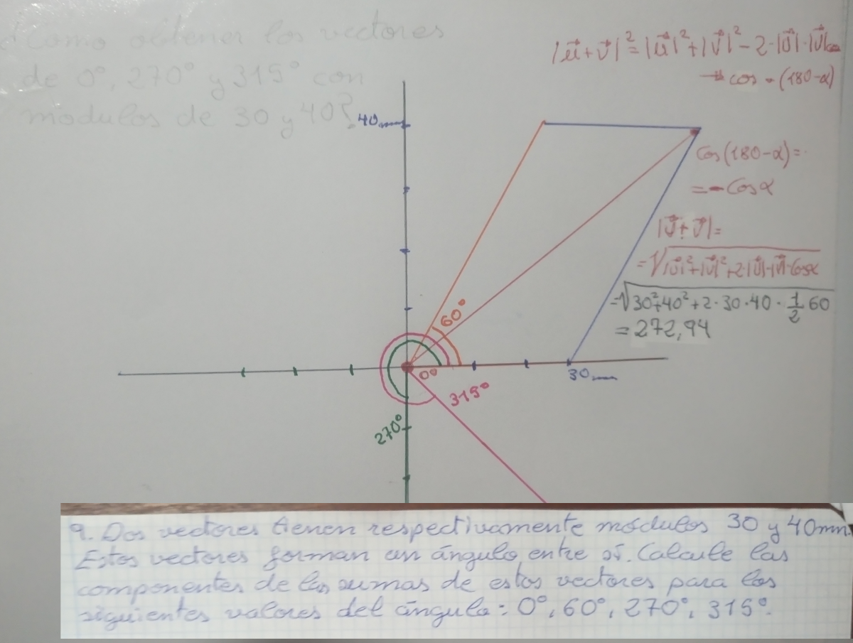 V(x)= 40 ∗ cos 315 = 28,28 V(y)= 40 ∗ sen 315 = -28,28