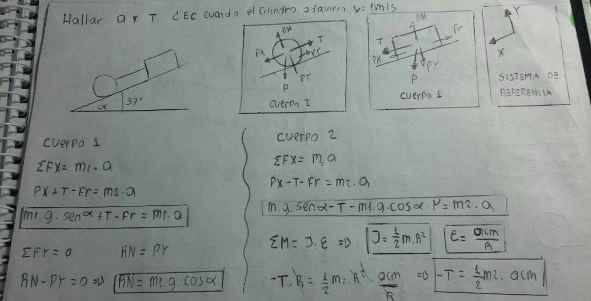 Bueno como ven eso fue lo que pude hacer porque despues nose como hacer para hallar la aceleracion ,y tambien lo de la suma de momentos = J.ε me confunde porque nose si en la suma de momento se toma tambien a la fuerza de rozamiento , yo solo puse la Tension , asi que por favor se que no acostumbran a responder dudas universittarias pero por favor al menos si pueden guiarme un poco, o en lo posible si me lo resuelven se los agradeceria de corazon