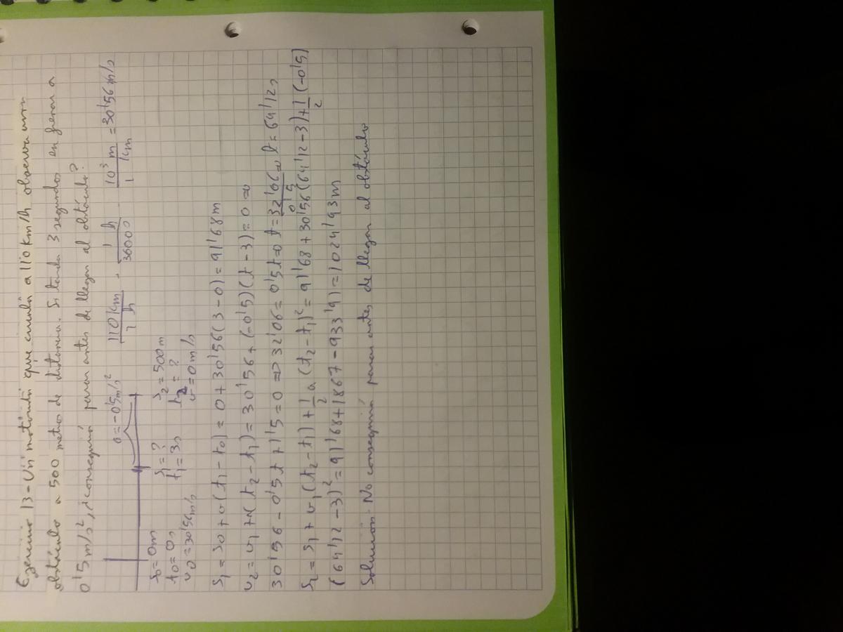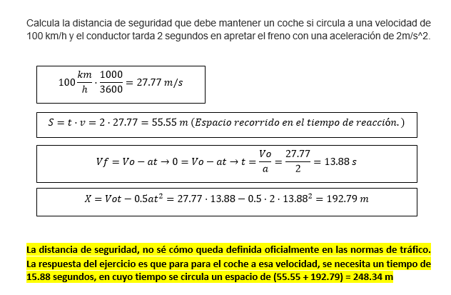 El ejercicio calcula la distnacia de seguridad que debe mantener un coche si circula a una velocidad de 100 km/h y el conductor tarda 2 segundos en apretar el freno con una aceleración de 2m/s^2.