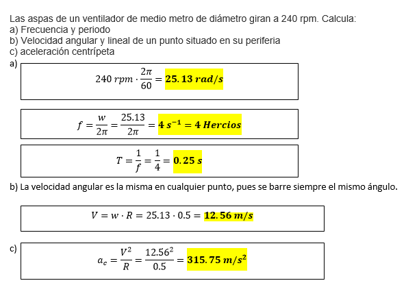 Las aspas de un ventilador de medio metro de diámetro giran a 240 rpm.Calcula:
