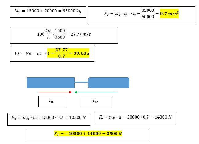 Un tren formado por la máquina y el vagón, unidos entre sí, circula a 100 km/h. La masa de la máquina es de 15000 kg y la masa del vagón de 20000 kg. Cuando se aplican los frenos,