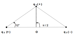 Se encuentra con una distribución de tres (3) cargas eléctricas puntuales en el vacío que tienen idéntico valor numérico pero distintos signos como se muestra a continuación. Habiendo efectuado mediciones se sabe que la fuerza eléctrica que la carga q2 ejerce sobre la carga eléctrica q3 vale F2-3 = 5.000,00 N.