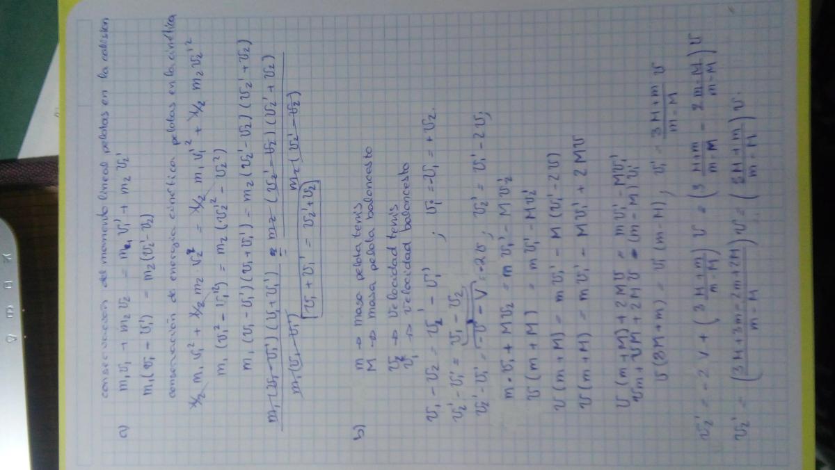 a) Dos masas m1 y m2 se mueven en una dimensión con velocidades v1 y v2, y en un determinado instante colisionan elásticamente. Calcula las expresiones de las velocidades después del choque en función de los parámetros anteriores. b) Una pelota de tenis de masa m se apoya sobre una pelota de baloncesto de masa M y el conjunto se deja caer desde una altura h. Los choques contra el suelo de la pelota de baloncesto y entre las pelotas se consideran ambos elásticos. Utilizando el resultado del apartado a) calcula la expresión de las velocidades de la pelota de baloncesto y de la pelota de tenis después del choque, así como de la altura que alcanzará cada una de ellas. c) calcula las velocidades después del choque en función de la altura inicial en el límite M>>m. d) Haz de nuevo el cálculo del apartado c) para el caso más realista m/M=0,1. Considera en todos los casos masas puntuales.