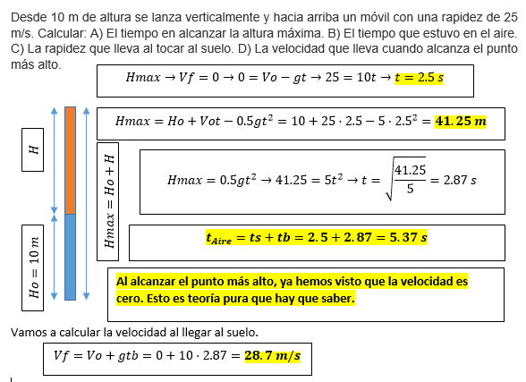 Necesito las respuestas de este problema: Desde 10 m de altura se lanza verticalmente y hacia arriba un móvil con una rapidez de 25 m/s. Calcular: A) El tiempo en alcanzar la altura maxima. B) El tiempo que estuvo en el aire. C) La rapidez que lleva al tocar al suelo. D) La velocidad que lleva cuando alcanza el punto mas alto