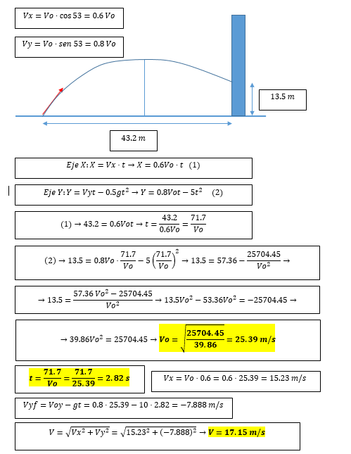 Se lanza un proyectil con un ángulo de 53° para que impacte en un edificio situado a 43,2m de distancia del punto de lanzamiento, en un punto del edificio situado a 13,5m.