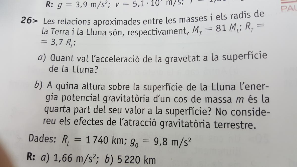 Las relaciones aproximadas entre la mas y los radios de la tierra y la luna son, Mt=81ML; Rt=3,7RL a)Cuanto vale la aceleracion de la gravedad en la superficie de la liuna? b) A que altura sobre la superficie de la luna la energia potencial gravitatoria de un objeto de massa m es la quarta parte de su valor en la superficie? No cosidres los efectos de la atracion gravitatoria terrestre. Datos Rl=1740km; g0=9,8 m/s^2