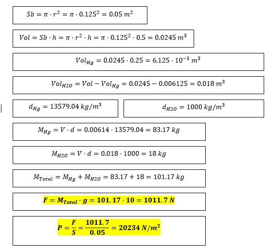 Hola me podrían ayudar con este ejercicio, "Un recipiente cilíndrico de 50 cm de alto y 25 cm de diámetro, se llena hasta la cuarta parte con mercurio y el resto se completa con agua. Calcular la presión y la fuerza sobre el fondo." Gracias