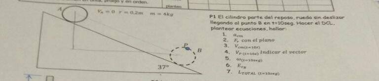 El cilindro parte del reposo rueda sin deslizar llegando al punto B en t= 10 seg